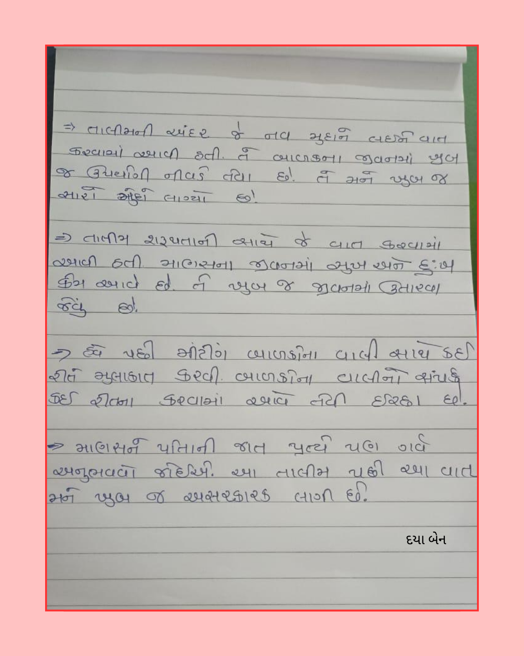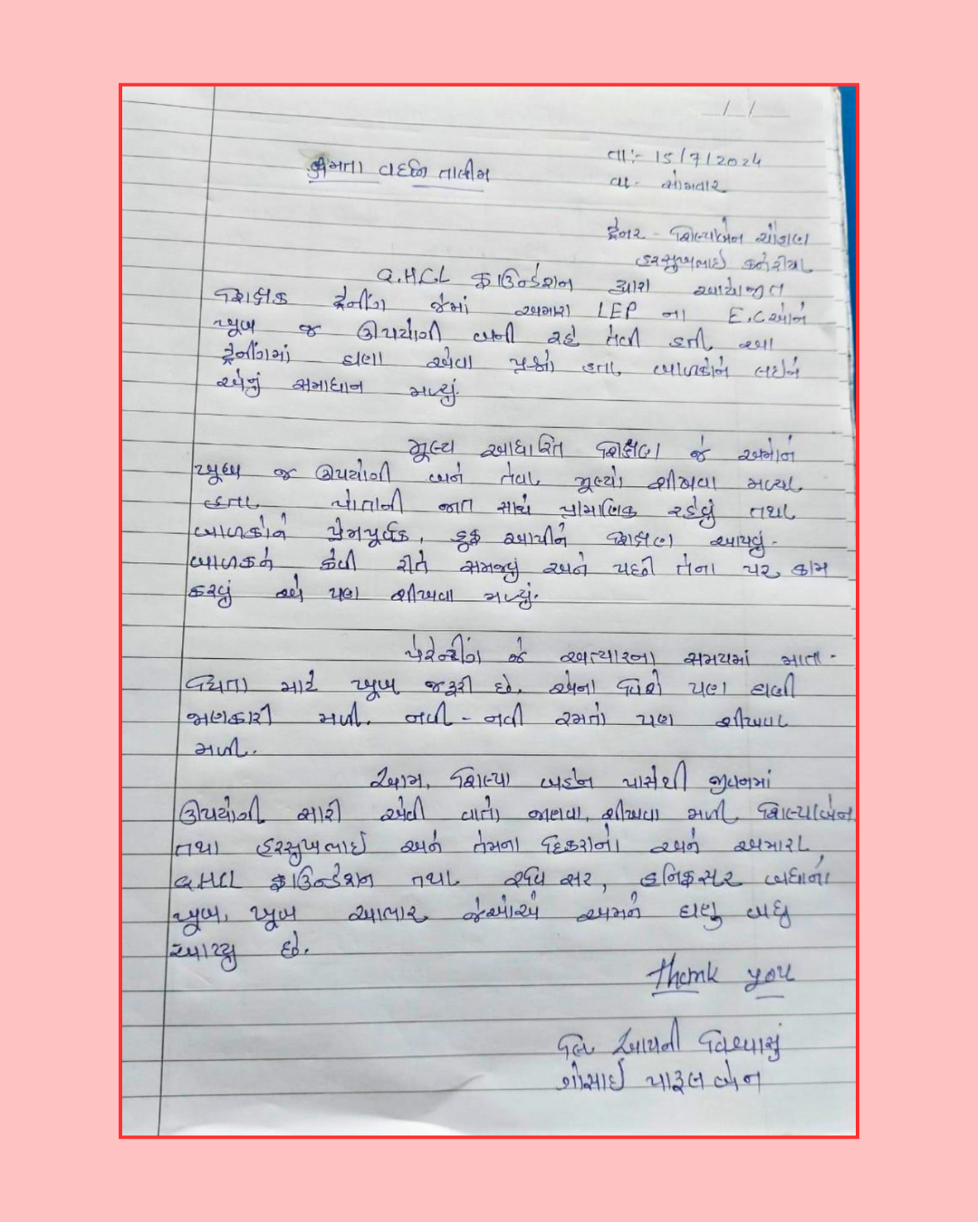 ટ્રેનર શિલ્પા બહેન ચૌહાણ દ્વારા જે માનવીય જીવનમાં કુલ 30 મૂલ્યો છે તે મૂલ્યો નો ખૂબજ રસપૂર્ણ અને પ્રવૃત્તિઓ દ્વારા જે સમજાવવામાં આવ્યું તે બદલ શિલ્પા મેમને ખૂબ ખૂબ ધન્યવાદ." 🙏🙏 અમારી જી.એચ.સી.એલ સંસ્થા દ્વારા પ્રિય બાળકોને વાંછન ગણન અને લેખનની સાથે સાથે બાળકોને પર્યાવરણ સ્વાસ્થ્ય અને સમાજ પ્રત્યે જાગૃતિ લાવવાનો અમારો પ્રયત્ન થોડો હતો પરંતુ આ ટ્રેનિંગ બાદ અને ખાસ કરીને 30 મૂલ્ય સમજ્યા બાદ અમારો જીવનમાં શિક્ષણ પર સમાજમાં પર્યાવરણ અને સ્વાસ્થ્ય પર વધારે ભાર મુકાયો.