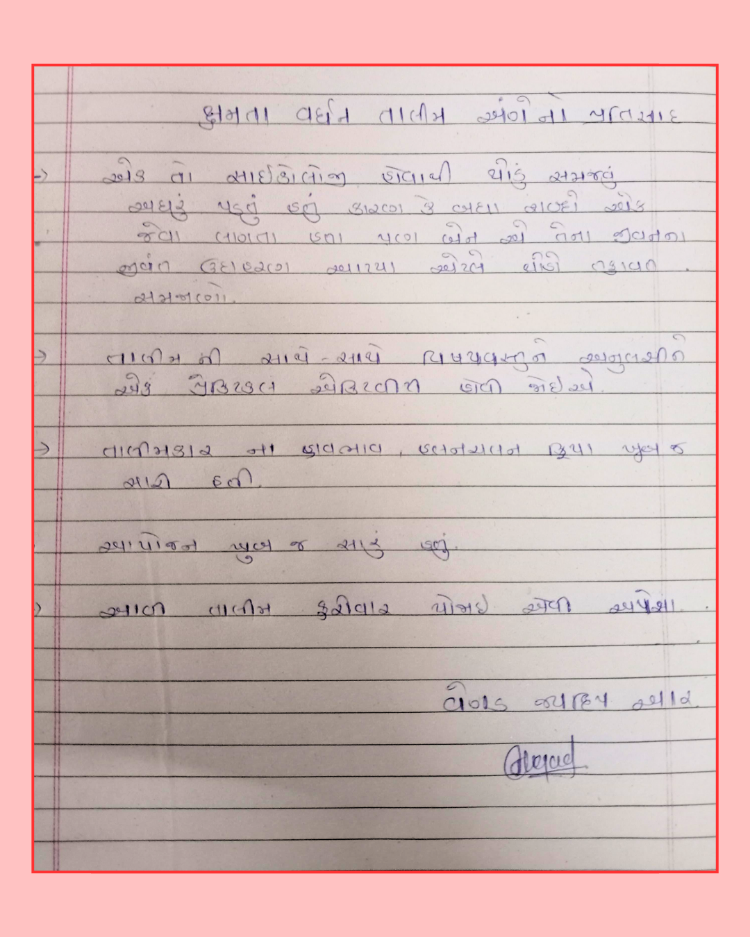 ક્ષમતા વર્ધન તાલીમ કાર્યક્રમ નું ખૂબજ સરસ રીતે આયોજન કરવામાં આવ્યું હતું. આ તાલીમ શિલ્પાબેન ચૌહાણ દ્વારા આપવામાં આવી હતી. આ તાલીમ માં મૂળ્ય આધારિત શિક્ષણ ની સમજ, વિવિધ મૂલ્યો, 20 વર્ષ ના શિક્ષણ પછી, તથા મૂળ્ય આધારિત શિક્ષણ નો કેટલો લાભ અને ફાયદાકારક છે તેની ખૂબજ સરળ રીતે ઉદાહરણ સાથે સમજુતી આપવામાં આવી હતી. ~ તાલીમ ની બેસ્ટ લાઇન " શિક્ષક સમાજ નો શિલ્પકાર " અભિપ્રાય